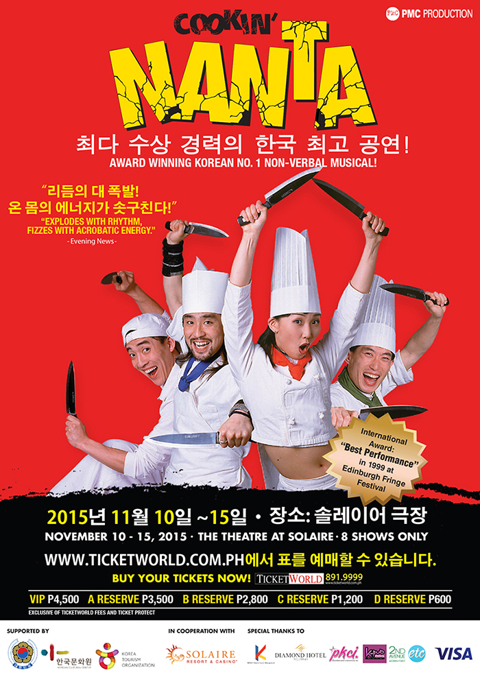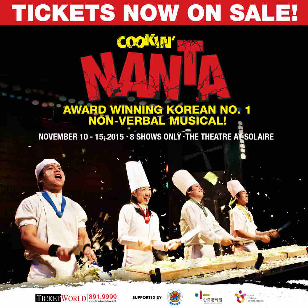 The Manila season of COOKIN’ NANTA opens on November 10, 2015. Tickets are on sale through TicketWorld. Call 891-9999 or visit www.ticketworld.com.ph. For group bookings, emailalma@ticketworld.com.ph.