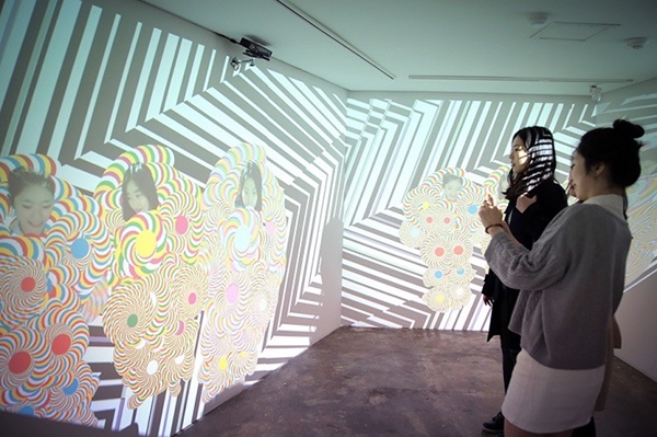 We face each other every day’ by Vakki. The movement of viewers will be reflected onto the wall of exhibition area by capturing their face using a camera.