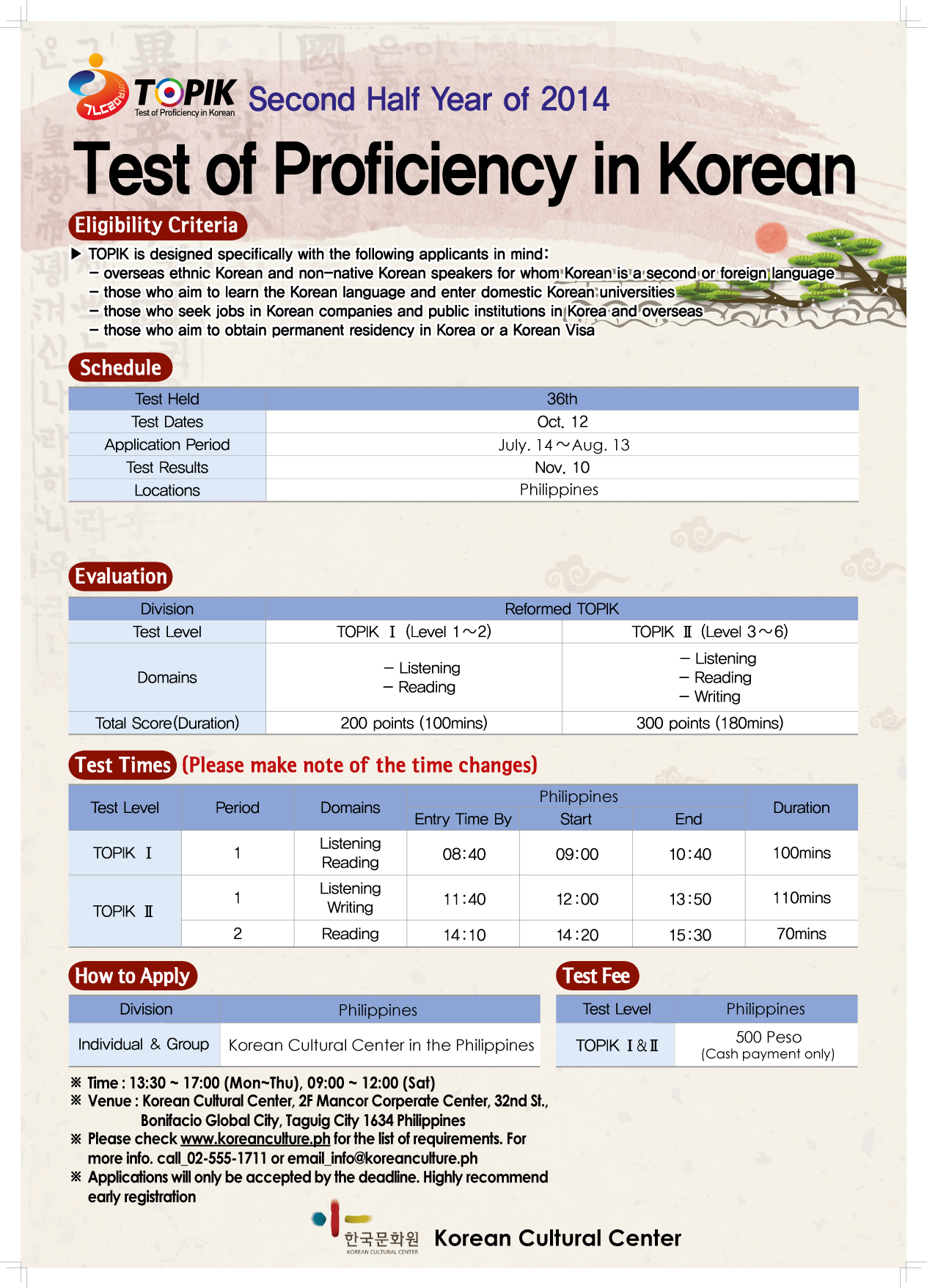 KCC to administer the 36th Test of Proficiency in Korean The Korean Cultural Center in the Philippines will be administering the 36th Test of Proficiency in Korean (TOPIK) on October 12, in its office at Fort Bonifacio, Global City. TOPIK, a Korean language test both for foreigners and overseas Koreans studying Korean, is generally used as a measure of proficiency in the said language by those whose native language is not Korean. In most cases, the results are used for school, company applications, permanent residency in Korea or a Korean Visa.
