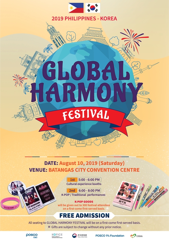 한국국제문화교류진흥원, 포스코건설, 우림복지재단과 한국문화원이 오는 8월 10일 바탕가스 한-필리핀 문화교류축제의 일환으로 '글로벌 하모니 페스티벌'을 개최합니다.
